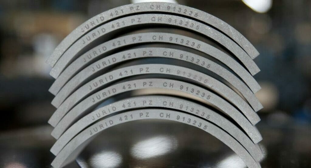 Neben Nummern und Bezeichnungen kann der e-Mark-CO2-Laser auch Barcodes auf unterschiedlichste Materialien wie Kunststoff, Gummi, Papier, Pappe, Folien oder beschichtete Metalle aufbringen. Die Bremsbeläge im Bild beschriftet er mit in einer Geschwindigkeit von bis zu 90 Millimeter pro Sekunde im Stillstand oder in Bewegung.