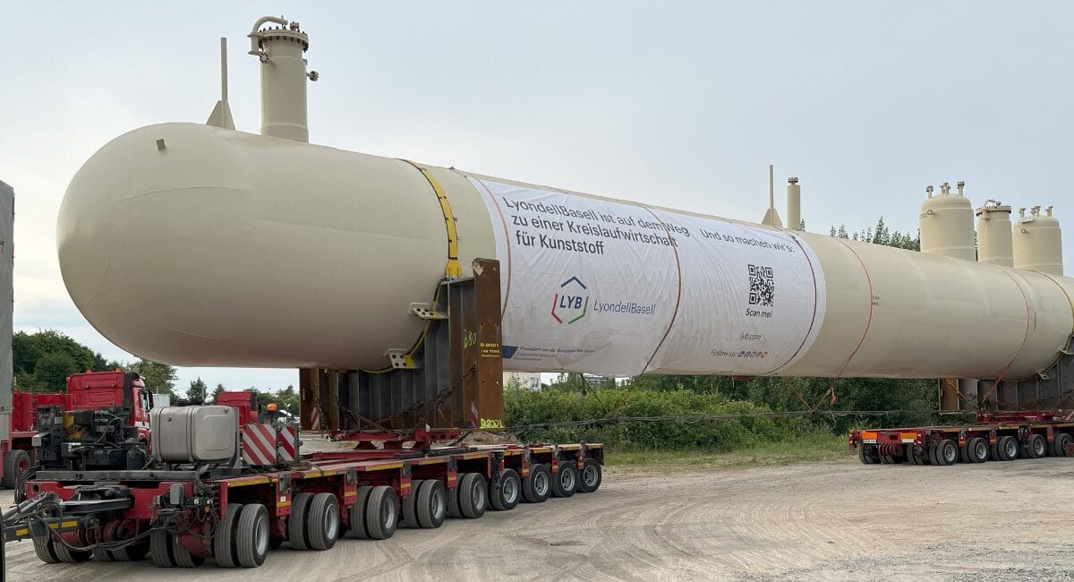 Mit der Anlieferung von Großtanks für die Lagerung von Pyrolyseöl schreitet der Bau der großtechnischen chemischen Recyclinganlage von LyondellBasell (LYB) in Wesseling voran.