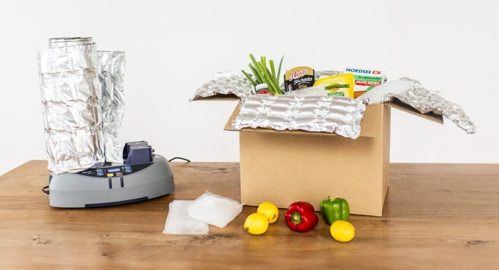 Der Kühlverpackungsspezialist Ecocool stellt jetzt seine Isolierfolie als kompakte Rolle zusammen mit einer handlichen Verpackungsmaschine zur Verfügung. Damit können Isoliereinlagen für Boxen direkt an der Verpackungsstation gefertigt werden. Die Lagerung von Iso-Verpackungsmaterial für temperatursensible Lebensmittel nimmt viel Platz weg und ist teuer. Gerade für den Online-Versandhandel ist dies mit einem großen logistischen und organisatorischen Aufwand verbunden. Deshalb bietet der Kühlverpackungsspezialist Ecocool nun die Thermo Airsafe-Lösung an. Kunden erhalten die zweilagige, metallisierte Isolierfolie als kompakte Rolle zusammen mit einer kleinen und handlichen Verpackungsmaschine geliefert. Somit kann die Isoliereinlage schnell und einfach direkt an der Verpackungsstation für die Boxen gefertigt werden; hohe Logistikkosten und Lagerbedarf entfallen. Die Maschine befüllt spezielle Kammern der Folie mit Luft, so dass eine circa zwei Zentimeter starke Isolationsschicht entsteht, die zusammen mit der metallisierten Folie für eine gute Isolationsperformance sorgt.