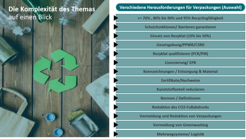 With a convincing opening presentation entitled „Threat or opportunity - What do the European regulations mean for packaging?“, Sonja Bähr, Packaging Analyst at Tilisco GmbH, was able to capture the attention of everyone in the room. She „got involved“ in categorising the latest developments and aspects at a time when it was not yet foreseeable how short-term and extensive the changes would be. She summarised pragmatic approaches in the Parliament's proposals and explained the requirements derived from the use of recyclates in plastic packaging, their evaluation or the minimum standard, with consequences for action. Hats off to her for this clear and committed speech: packaging is increasingly in the area of conflict between sustainability as a legal obligation, technical requirements and their tasks as a marketing tool. Companies should prepare at an early stage for how PPWR and EcoFee modulation or EPR could affect the company's specific projects.