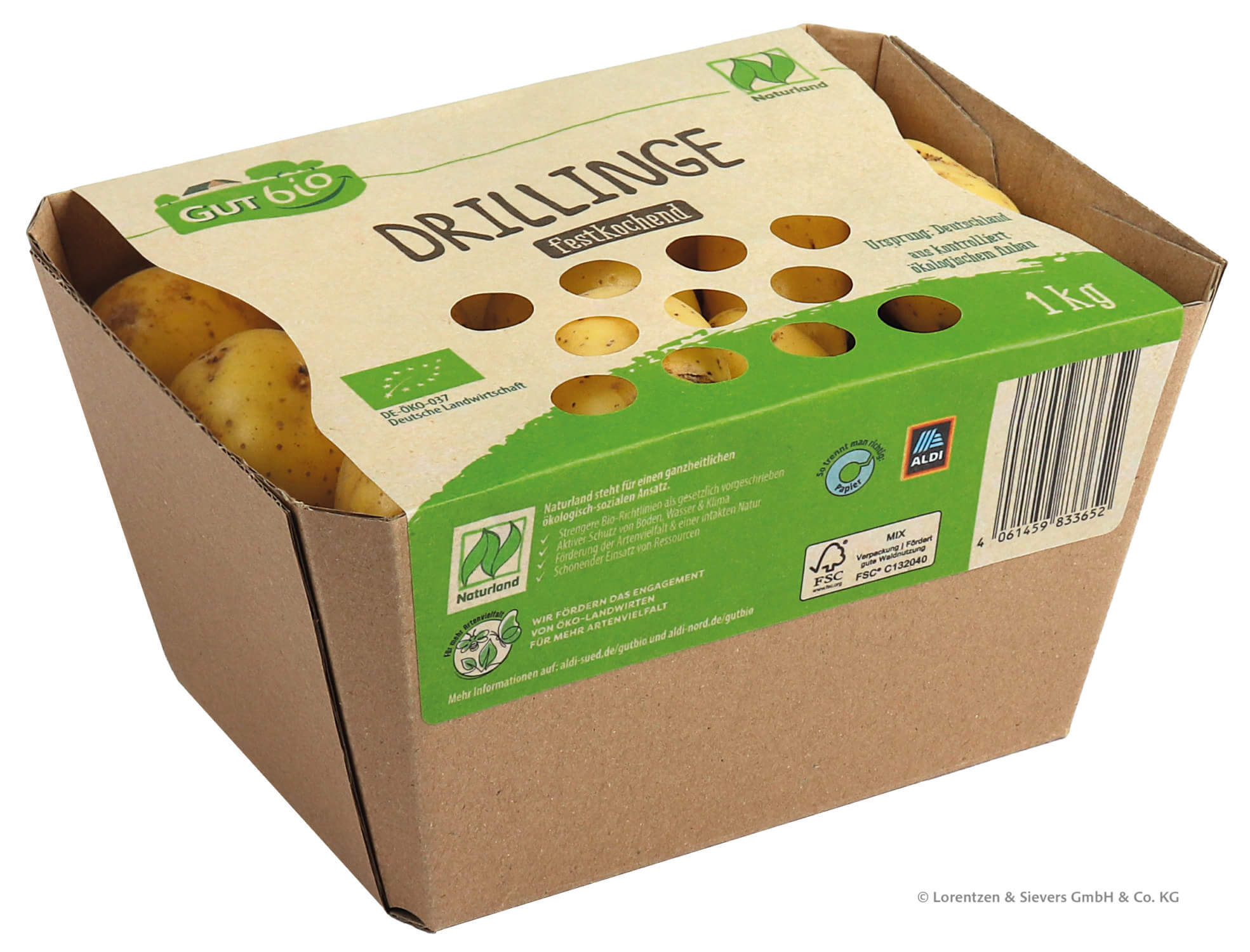 The paper-based lid label for fruit and vegetable trays is an innovative banderole that replaces conventional plastic film while still revealing the product. This solution was honoured using the example of "Drillinge" potatoes because it proves that fully recyclable, visible paper packaging without any plastic is technically and industrially feasible - a showcase project for sustainable fresh produce packaging.