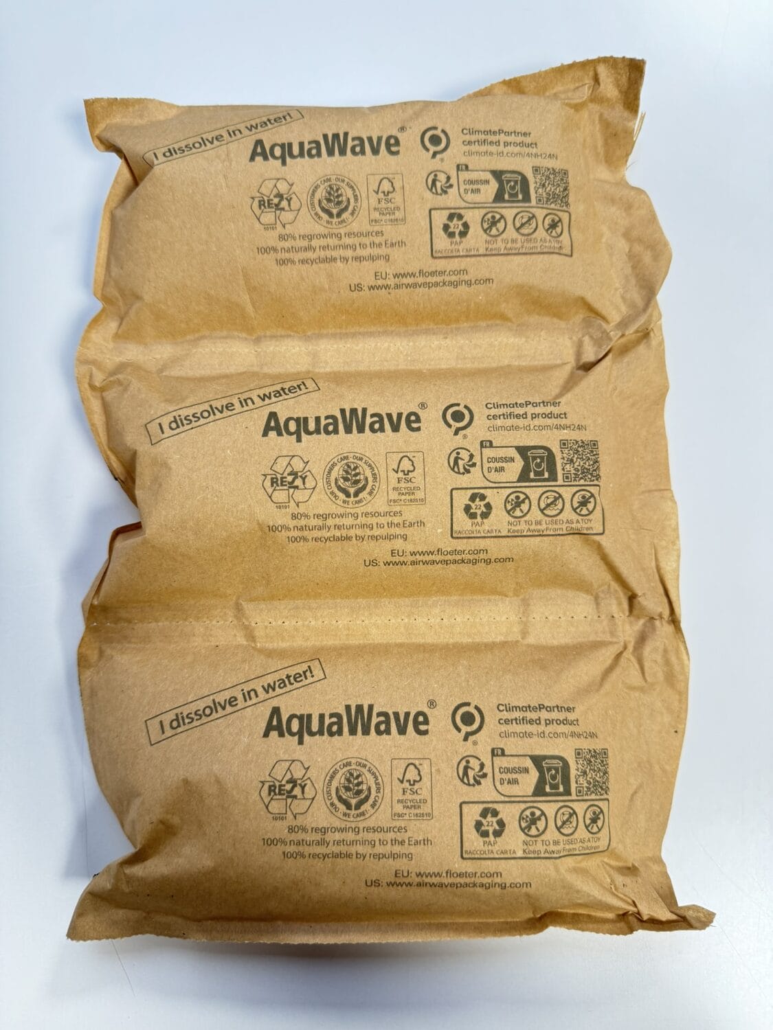 Aquawave sind revolutionäre Luftkissen, die als umweltfreundliche Alternative zu herkömmlichen Füllmaterialien aus Kunststoff dienen. Das Besondere: Die Kissen bestehen aus einem Material, das sich vollständig und rückstandsfrei in Wasser auflöst und biologisch abbaubar ist. Ausgezeichnet wurde diese Lösung, da sie eine echte Kreislaufwirtschaft ermöglicht. Sie vermeidet Plastikmüll sowie Mikroplastik und ist zudem für den Heimkompost zertifiziert, ohne bei der Schutzwirkung Kompromisse einzugehen.