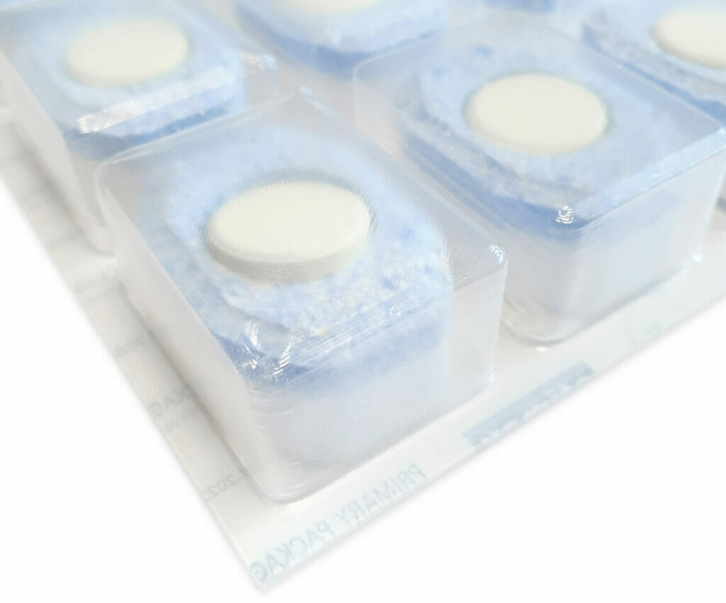 Die Mono-Peel-Push-Folie eignet sich zum Einsatz bei Pharmaprodukten, Hygieneartikeln sowie gefährlichen Haushaltsprodukte wie Batterien, Spülmaschinentabs (Bild) oder Klebstoffen. Sie wird per Thermolaminierung fixiert, die Verarbeitung auf FFS-Anlagen sorgt für effektive Produktionsprozesse inklusive Gewichtseinsparung und sortenreiner Recyclingfähigkeit der Komplettverpackung.