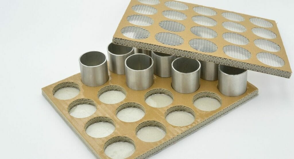 Im Gepäck haben die Experten auch die nachhaltige VCI-Spenderkapsel Emibo Natur, die zu 100 Prozent aus nachwachsenden Rohstoffen besteht. Außerdem wird ein Verfahren zur konturengetreuen Laminierung von Ladungsträgern mit VCI-Folie, das Excor Valeno Layertray (Beispiel im Bild), vorgestellt. Die Laminierung, die sogar für komplexe geometrische Formen möglich ist, nimmt z. B. Trays aus Wellpappe oder Faserguss ihre im direkten Kontakt zu Metallen korrosionsfördernde Eigenschaft und spendet in einer geschlossenen Umverpackung VCI-Korrosionsschutz.