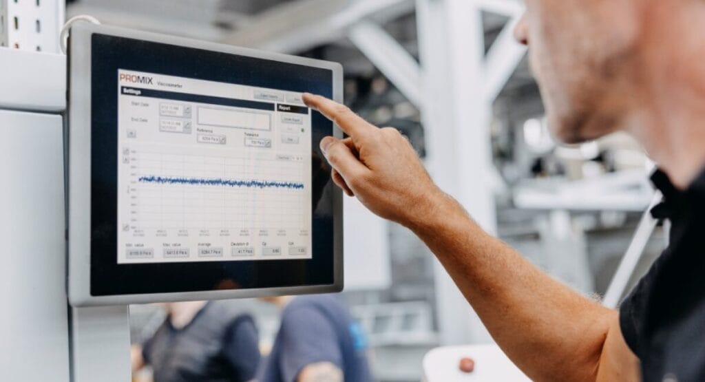 Da alle relevanten Daten für 12 Monate gespeichert werden, können entsprechende Auswertungen auch nach Ablauf der Produktion ausgelesen und bewertet werden. Hierzu gibt es beim Visco-P drei Möglichkeiten. Über eine externe Schnittstelle (FeldBus, ProfiNet, …) können die Daten direkt an eine andere Steuerungseinheit gesendet und dort verarbeitet werden. Die Daten können via TeamViewer oder einen USB-Stick ausgelesen, gespeichert und durch einen externen Computer ausgewertet werden. Die dritte Möglichkeit ist im Visco-P integriert und erstellt einen Report über die Viskosität mit allen relevanten Rahmenbedingungen und statistischen Auswertung mit Maximalwert, Minimalwert, Durchschnittswert, Abweichung, Cp und Cpk. Zusätzlich wird die Viskosität über den Betrachtungszeitraum mit Ober- und Untergrenze graphisch dargestellt.
