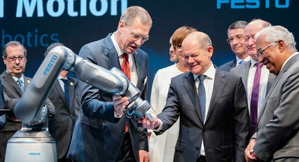 Am 30. Mai startete die Hannover-Messe. Mit von der Partie: Bundeskanzler Olaf Scholz. Am Stand vom schwäbischen Automatisierungsspezialisten Festo besichtigte er gemeinsam mit dem portugiesischen Premierminister António Costa den weltweit ersten pneumatischen Cobot. Der Festo-Vorstandsvorsitzende Oliver D. Jung zeigte Olaf Scholz und António Costa, wie sensitiv die Mensch-Roboter-Kollaboration mit der nachgiebigen Pneumatik gelingt. Der Bundeskanzler konnte sich selbst von der beinahe "menschlich-kollegialen" Zusammenarbeit mit dem weltweit ersten pneumatischen Cobot überzeugen, der bei einem Zusammenstoß mit dem Menschen innerhalb von Millisekunden einen sicheren und dabei soften Stopp einlegt. Viele seiner Vorteile wie etwa seine Sensitivität oder sein Gewicht verdankt der Festo Cobot den Vorzügen der Pneumatik: Die Direktantriebe in den Gelenken sind kostengünstiger und besonders leicht, weil im Gegensatz zu elektrischen Lösungen keine schweren Getriebe und teure Kraft-Moment-Sensorik nötig sind. Quelle: Festo