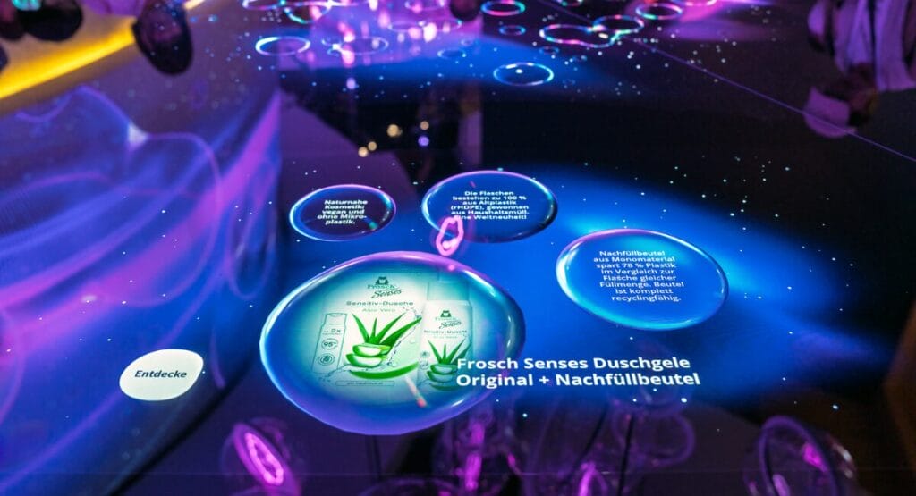 Am interaktiven Medientisch können Besucherinnen und Besucher die vorgestellten Produkte – hier das Duschgel von Frosch Senses – näher erkunden und so tiefer in den Kosmos der Circular Economy eintauchen. (Bild: Werner & Mertz/Stefan Schilling)