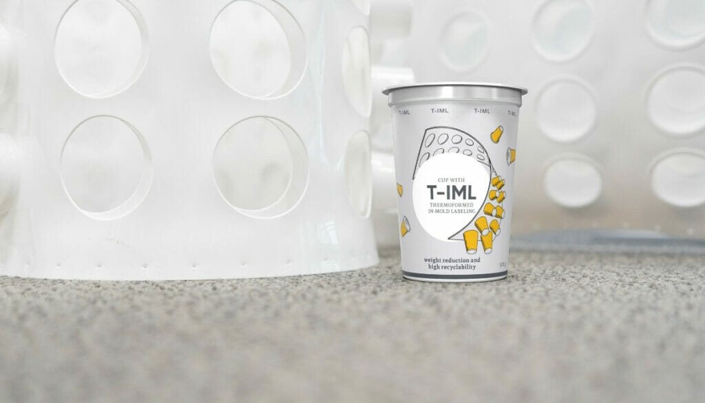Das österreichische Verpackungsunternehmen Greiner Packaging präsentiert einen tiefgezogenen Becher, der mittels IML bereits in der Form mit einem Label versehen wird. Im Vergleich zum Spritzguss reduziert sich das Gewicht um 25 Prozent.