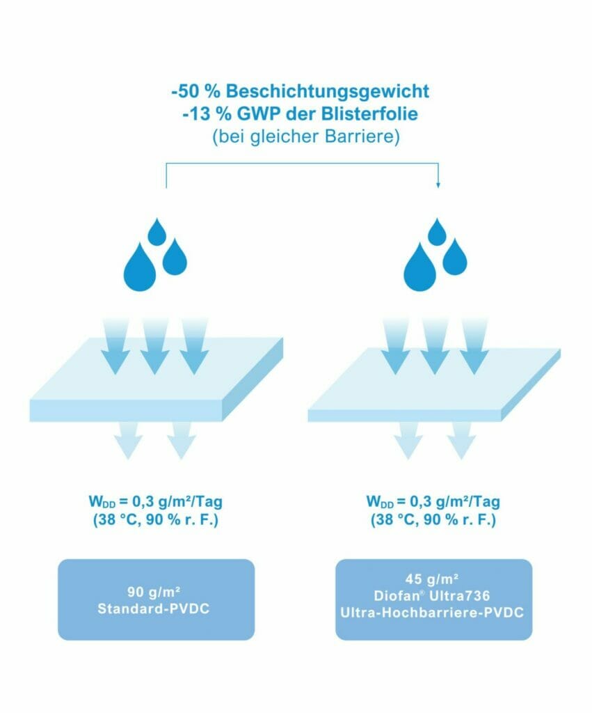 Dank ihrer ultrahohen Barriereleistung führt Diofan Ultra736 ohne Funktionseinbußen zu dünneren Beschichtungen als dies etwa mit gängigen PVDC-Folien möglich wäre. Vor allem bei Duplex- Barrierestrukturen hat sich gezeigt, das sich mit Diofan Ultra736 die Anzahl der erforderlichen Basisschichten bei gleicher Wasserdampfbarriere halbieren lässt. Diese Lösung kann dazu beitragen, den Gesamtkohlenstoffabdruck fertiger Blisterfolienstrukturen um bis zu 13 Prozent zu reduzieren.