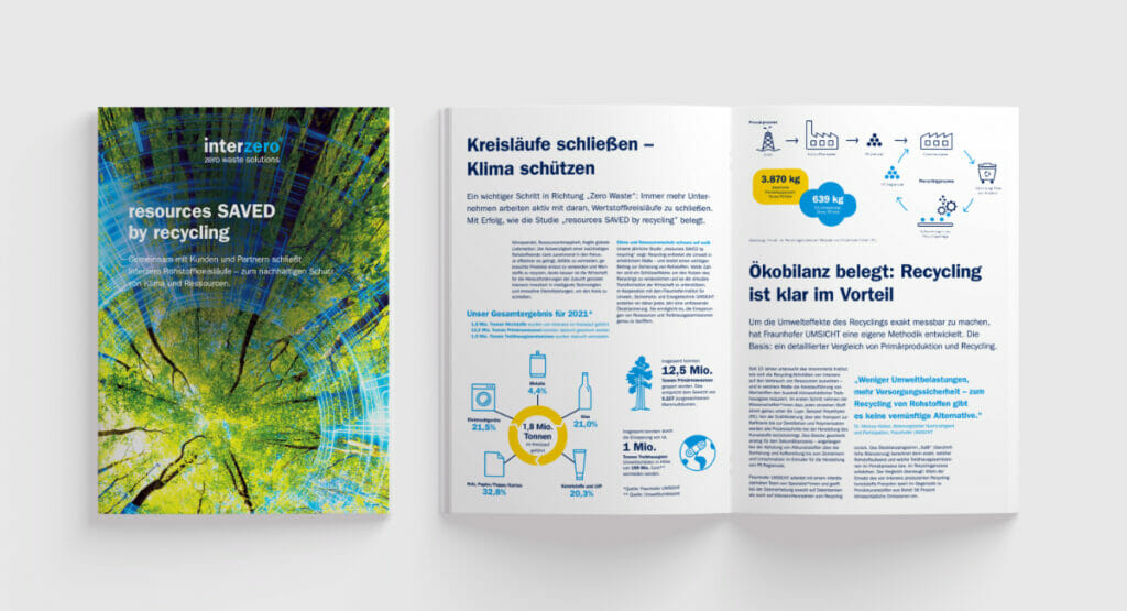 Die nun veröffentlichte Studie von Fraunhofer Umsicht „resources SAVED by recycling“ belegt die positive Wirkung erneut. Durch die Kreislaufführung von insgesamt 1,8 Millionen Tonnen Wertstoffen konnte Interzero 2021 mit seinen Kunden rund 12,5 Millionen Tonnen Primärressourcen einsparen. Zudem konnte der Ausstoß von rund einer Million Tonnen Treibhausgasen vermieden werden. Ohne den Einsatz von Interzero wären das Kosten für klimabedingte Umweltschäden in Höhe von 199 Millionen Euro (gemäß Umweltkostenermittlung des Umweltbundesamtes). Die aktuelle Einsparung an Primärressourcen entspricht dem Gewicht von 5.227 ausgewachsenen Mammutbäumen.