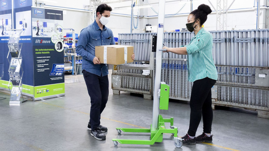 „Kontaktlose“ Übergabe mit der Einsteiger-Variante Basic des mobilen Transport- und Hebegeräts lift2move. (Bild: Expresso)