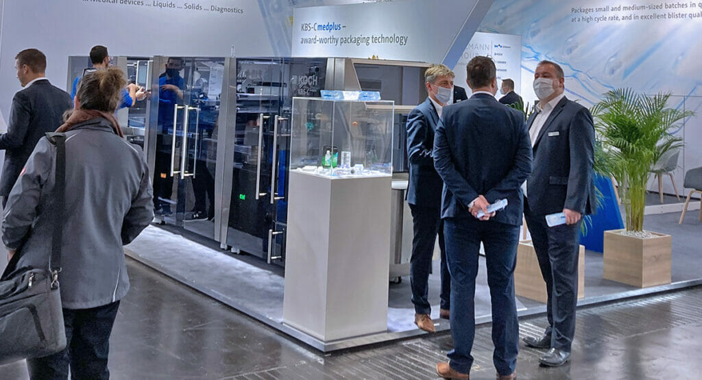 Am Messestand fanden Gespräche mit vielen internationalen Besuchern statt. Diese zeigten sich interessiert an der Funktionsweise und der hohen Varianz der KBS-C. Das Maschinenkonzept vereint eine große Formfläche mit kleinsten Maschinenabmessungen, und ein einfacher Aufbau mit schnellem Set-Up ermöglicht den wechselnden Einsatz im normalen Verpackungsbereich und im Reinraum bis ISO-Klasse 7.