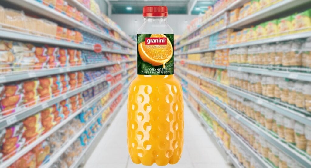 Das Etikett der Flasche des Granini Trinkgenuss Orange ist nahezu unverändert, einen Hinweis auf die neue Zusammensetzung der Zutaten suche man vergebens. Lediglich die prominente Auslobung „100 % Fruchtsaft“ fehlt auf der Banderole, werde aber unverständlicherweise nicht durch die Angabe „50 % Fruchtsaft“ ersetzt.
