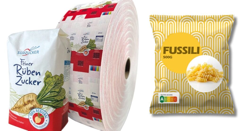 Die Automatenrollen eignen sich ideal für vertikale Form-, Füll- und Schweißmaschinen (VFFS) und damit für die sichere Verpackung von Produkten wie Mehl, Zucker, Pasta oder Frühstücksflocken. Sie sind zertifiziert nach BRC-Standard und auf Wunsch aus PEFC-, FSC-zertifiziertem oder Recyclingpapier erhältlich. Mit Druckbreiten bis 125 cm und bis zu 11 wasserbasierten, lösemittelfreien Farben im Flexodruck entstehen Verpackungen, die technisch überzeugen und optisch herausstechen. Schutzlack, Antirutschlack sowie optionale Siegellack- oder Barrierelack-Beschichtungen sorgen für Stabilität, sichere Lagerung und Transport.Flow-Wrap-Papierrollen – nachhaltige Alternative zur Folienverpackung