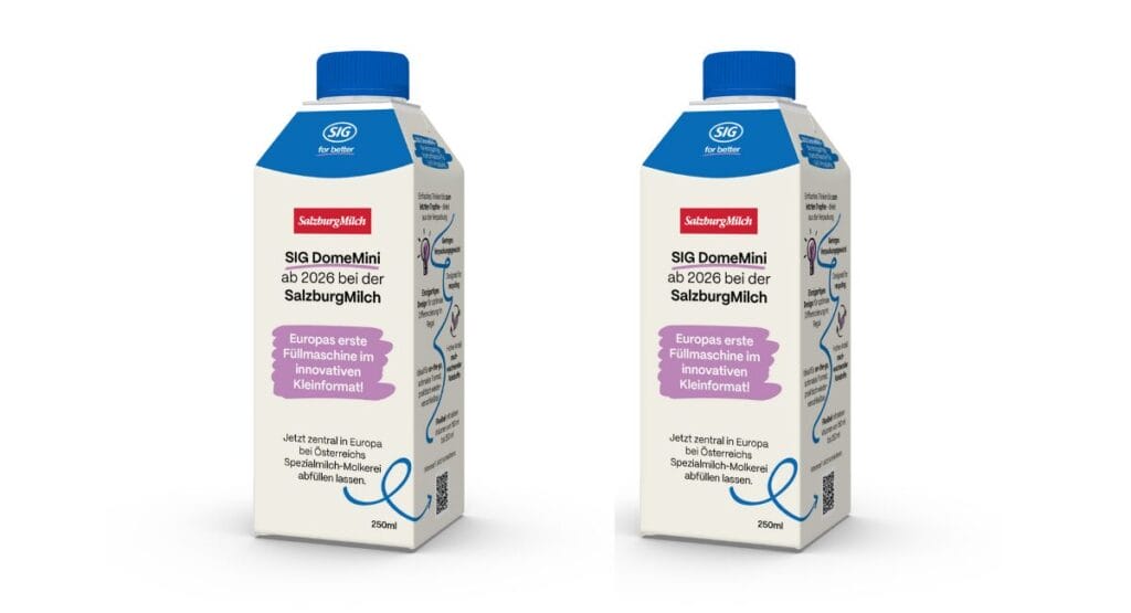 Das österreichisches Molkereiunternehmen SalzburgMilch will Mitte 2026 als erstes Unternehmen in Europa Produkte in der On-the-go Kartonflasche SIG DomeMini launchen.
