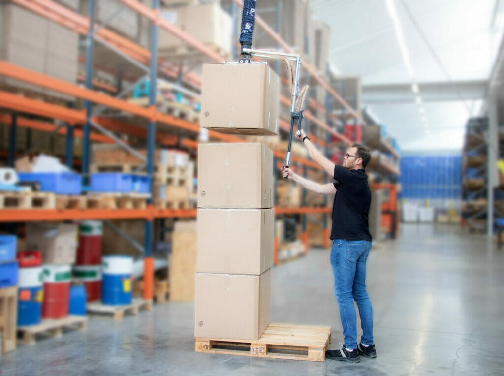 Die Handhabung des stackLift (Bild) erfolgt über eine Zweihandbedienung: Diese erlaubt, schwere Hebegüter mit zwei Händen zu führen, präzise zu positionieren und anschließend leicht zu lösen. Der speziell konstruierte Handgriff ist dabei für Links- und Rechtshänder individuell verstellbar und stellt dadurch eine sichere Nutzung und ein einfaches Heben und Senken der Waren sicher. Zudem kann mit dem Schnellwechselsystem für die Sauggreifer auf verschiedene Waren reagiert werden, sodass ein schnelles Umrüsten mit nur einem Handgriff möglich ist.