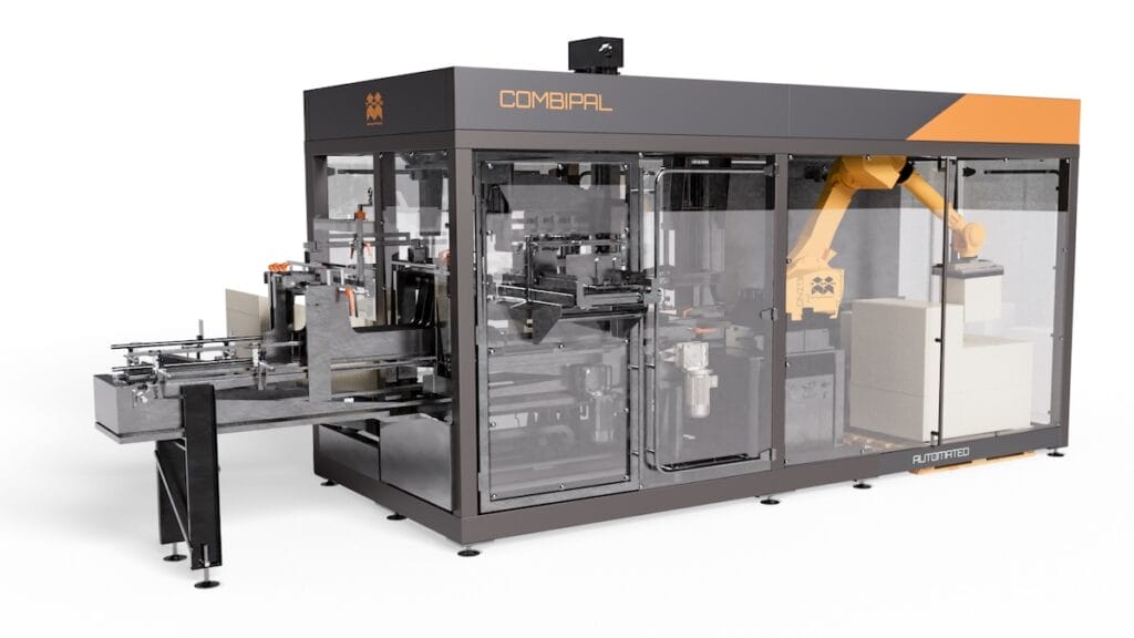 Der Monoblock TMG Modell CombiPal N MID kombiniert Kartonaufrichtung, Befüllung und Verschluss mit einer integrierten Palettierung per Industrieroboter. Die kompakte Bauweise ermöglicht die Installation auch auf engem Raum. Neben Glas- und Kunststoffflaschen können Kanister, Dosen und Beutel verarbeitet werden.