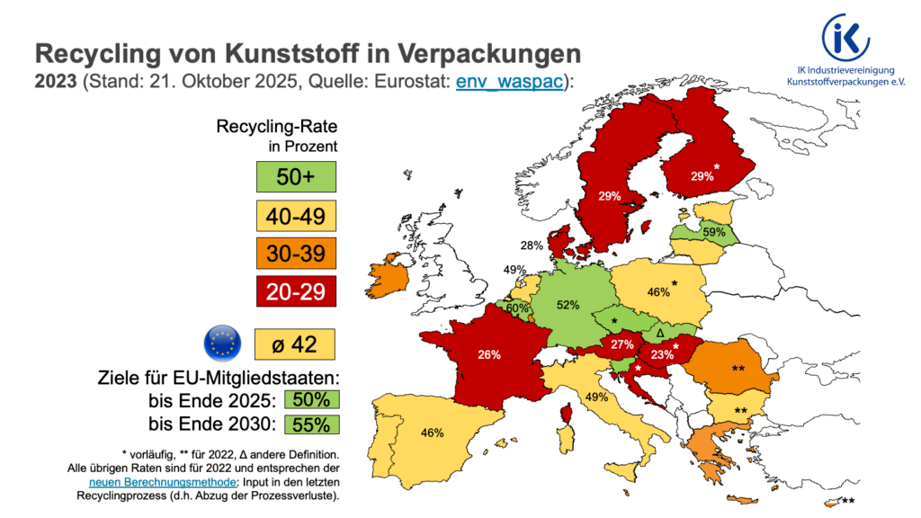 Das Recycling von Kunststoffverpackungen entwickelt sich in Europa positiv – allerdings mit deutlichen Unterschieden zwischen den Mitgliedstaaten. Laut Eurostat-Daten für das Jahr 2023 liegt die durchschnittliche Recyclingquote in der EU bei 42 Prozent. Deutschland gehört mit 52 Prozent weiterhin zur Spitzengruppe.