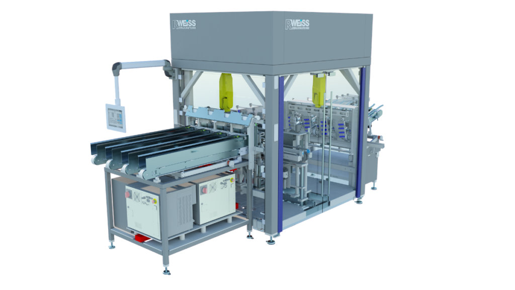 Für den einwandfreien Funktionsablauf beim Verarbeiten von Kunststoff-Trays setzt R.Weiss auf eine Neuentwicklung für das Entstapeln und Verschließen von Trays und Blistern aus Kunststoff. Eine Besonderheit bildet dabei die integrierte Roboterkollaboration, bei der zwei verbaute 6-Achs-Roboter Hand in Hand arbeiten und durch ihre präzise Verarbeitung der Trays für eine hohe Anlagenverfügbarkeit und Prozesssicherheit sorgen. Die Maschinen wurden dabei auf Basis der UNIROB Standardzellen konzipiert und bieten ein Höchstmaß an Flexibilität in Bezug auf unterschiedliche Tray-Formate und -Formen. Zudem sind die 6-Achs-Roboter mit einem innovativen vollautomatischen Multi-Roboter-Werkzeug ausgestattet, das bei verschiedenen Formaten auf Knopfdruck gewechselt werden kann. Außerdem lässt sich das Tray-Magazin mit wenigen Handgriffen schnell auf alle gängigen Tray-Größen und -Formen umstellen. Die Verarbeitungskapazität von Entstapler und Verdeckler reicht von rechteckigen oder quadratischen Formen unterschiedlichen Formats bis hin zu runden Formen. Je nach Format sind bis zu 200 Takte pro Minute möglich.