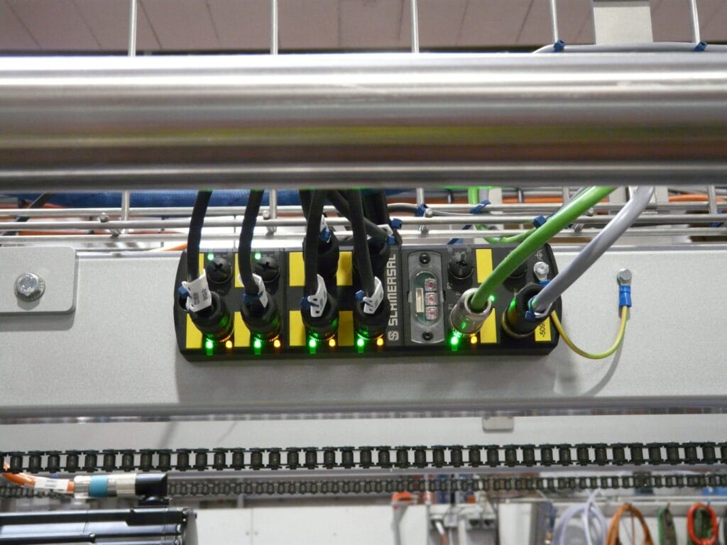 In dieser Anlage sind fünf Safety-Fieldbox-Einheiten verbaut. Angeschlossen sind u. a. 20 Sicherheitszuhaltungen vom Typ AZM 300, elf Not-Halt-Taster und ein Sicherheitslichtvorhang. Bei der Mehrzahl der auch untereinander verbundenen Feldboxen sind alle Geräteanschlüsse belegt.