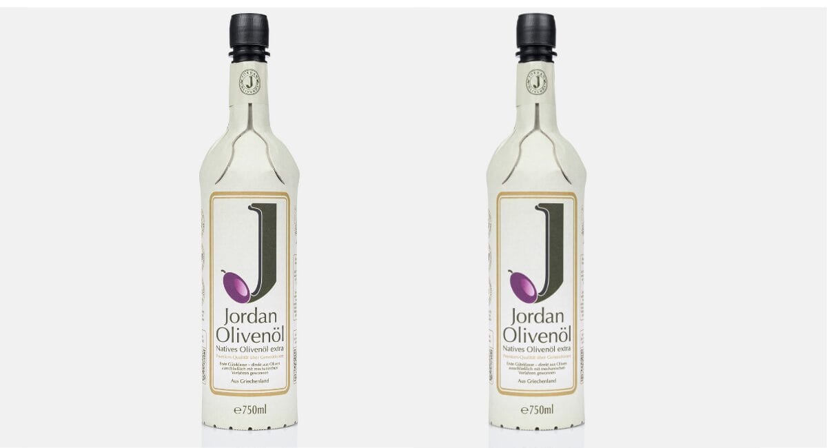Jordan bringt Olivenöl in einer Papierflasche aus 94 Prozent Karton mit einem dünnen Innenschlauch aus recyclingfähigem Monomaterial und eigens entwickeltem Ausgießer auf den Markt.