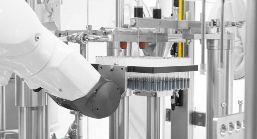 Die Maschine ist mit zwei manuellen Be- und Entladestationen ausgestattet, in die ein Bediener die zuvor unter einem laminaren Luftstrom von ihrem Verpackungsbeutel befreiten Tubs einsetzt. Ein Roboterarm ergreift das im Tub befindliche Nest mit den leeren VEG und positioniert es unter die beiden Füllköpfe, die mit den Schlauchpumpen verbunden sind. Die Glasbehältnisse können nun mit einer beliebigen Füllmenge ab 0,1 ml befüllt werden. Zusätzlich zu den doppelten Füllköpfen ist die Maschine auch mit zwei Stopfensetzköpfen ausgestattet. Das Befüllen und Stopfensetzen erfolgt gleichzeitig. Nach Abschluss des Vorgangs positioniert der Roboterarm das Tub wieder im Nest an der Ausgabestation, so dass der Bediener es entnehmen und dem sekundären Verpackungsprozess zuführen kann.