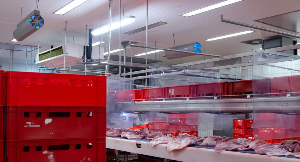 Doch auch über die Luft können sich Keime und Schimmelsporen verbreiten. Daher verhindern Verdampferdesinfektionsanlagen, dass sich auf den Lamellen von Klimatisierungsgeräten Biofilme bilden, während TR-Systeme einfach in der Wandung von Lüftungsgehäusen und -kanälen installiert werden. Die speziellen UV-C-Umluftdesinfektionsgeräte mit der Bezeichnung „ULE2000“ verfügen dagegen über einen integrierten Ventilator, der das Volumen des Luftstroms auf die Leistung der Strahler abstimmt und die Raumluft so permanent reinigt (im Bild im Einsatz bei der Fleischwaren Berger GmbH). Alle Geräte werden auf der IFFA in Frankfurt gezeigt.
