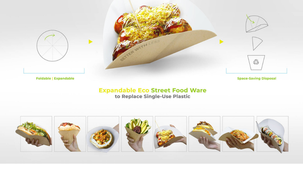 Das Konzept sei besonders flexibel sowie kunststofffrei und biete damit eine einfache und trendige Alternative zu den Kunststoff- und Styropor-Behältern, die im Fast-Food-Sektor üblich sind. Flach ausgebreitet hat das Kartonbehältnis einen Durchmesser von 25 Zentimetern. Es bietet mindestens acht unterschiedliche Faltmöglichkeiten, von der Spitztüte bis zum Teller und kann für die unterschiedlichsten Speisen genutzt werden. Das Konzept ist materialsparend und minimiert den Platzbedarf bei der Lagerung sowie das Materialvolumen bei der Entsorgung und beim Recycling.