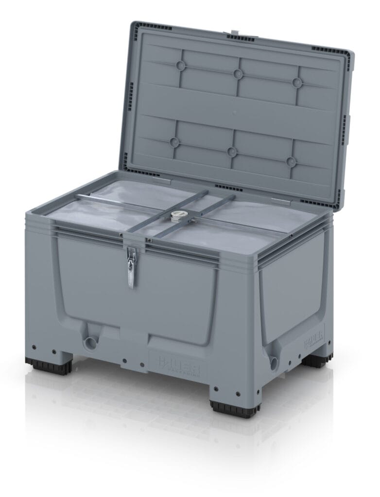 Auch Transportverpackungen entwickeln sich weiter. Auer Packaging zeigt beispielsweise den Eurobehälter mit Scharnierdeckel Pro, der für Anwendungen mit erhöhtem Schutzbedarf konzipiert ist. Eine integrierte Gummidichtung und Spannhebelverschlüsse sorgen laut Hersteller für Spritzwasserschutz und Staubdichtigkeit. Für größere Mengen an Flüssigkeiten oder Granulaten bietet das Unternehmen zudem einen Bag-in-Box-IBC an, der einen stabilen Mehrwegbehälter mit austauschbaren Inliner-Beuteln kombiniert.