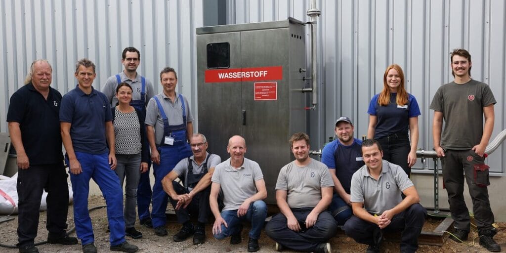 Mitarbeiter:innen von Koenig & Bauer MetalPrint, Pano Verschluss und Alfred Kruse Maschinen- und Metallbau beim Wasserstofftest in 2023 (Bild: Koenig & Bauer)