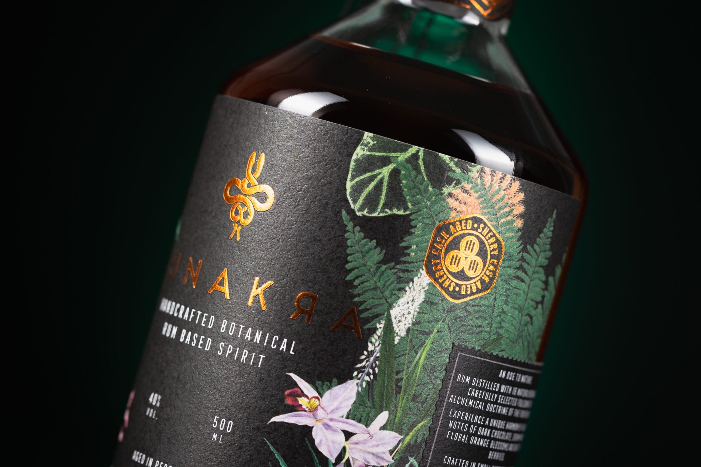 Das Etikett für den Munakra - Botanical Rum ist ein Meisterwerk der Druckkunst, das durch sein mystisches Design mit exotischen Pflanzenmotiven besticht. Ausgezeichnet wurde es für seine außergewöhnliche technische Umsetzung: Der beidseitige Druck, der durch die Flasche sichtbar wird, sowie die Veredelung mit Kupferfolie und Prägung schaffen ein einzigartiges Erlebnis, das den Premium-Charakter des Produkts unterstreicht.